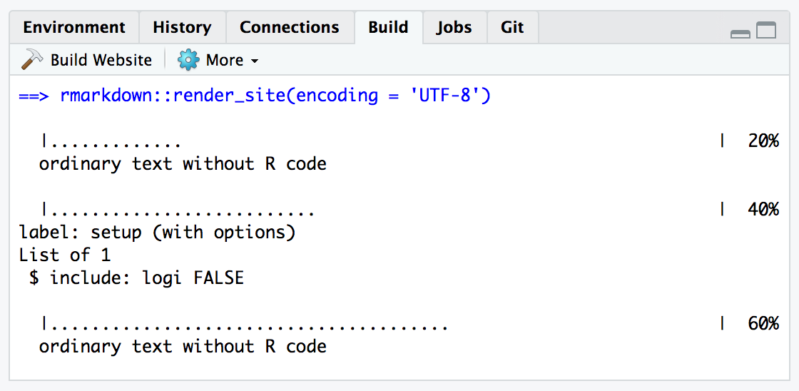 To build a website from the command line, use the rmarkdown::render_site() function: