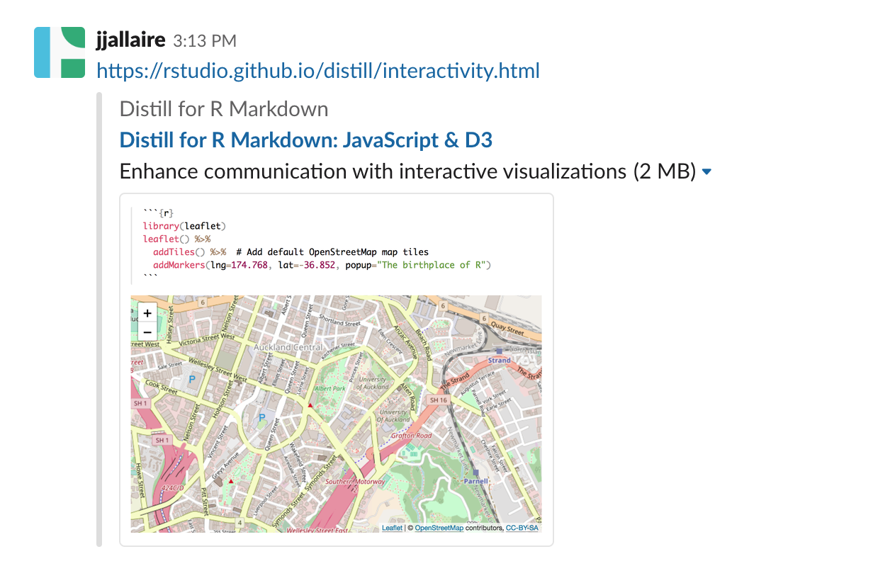 The Open Graph protocol is a specification that enables richer sharing of links to articles on the web. Open Graph metadata is automatically generated for Distill articles. For example, here’s what you see in Slack when pasting in a link to the article on using JavaScript and D3 within Distill articles: