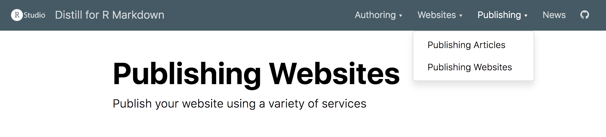 This article describes how to create a website that contains a collection of Distill articles. Distill websites include a top level navigation bar that enables readers to discover and browse articles. For example, the documentation pages you are reading now are a Distill website.
